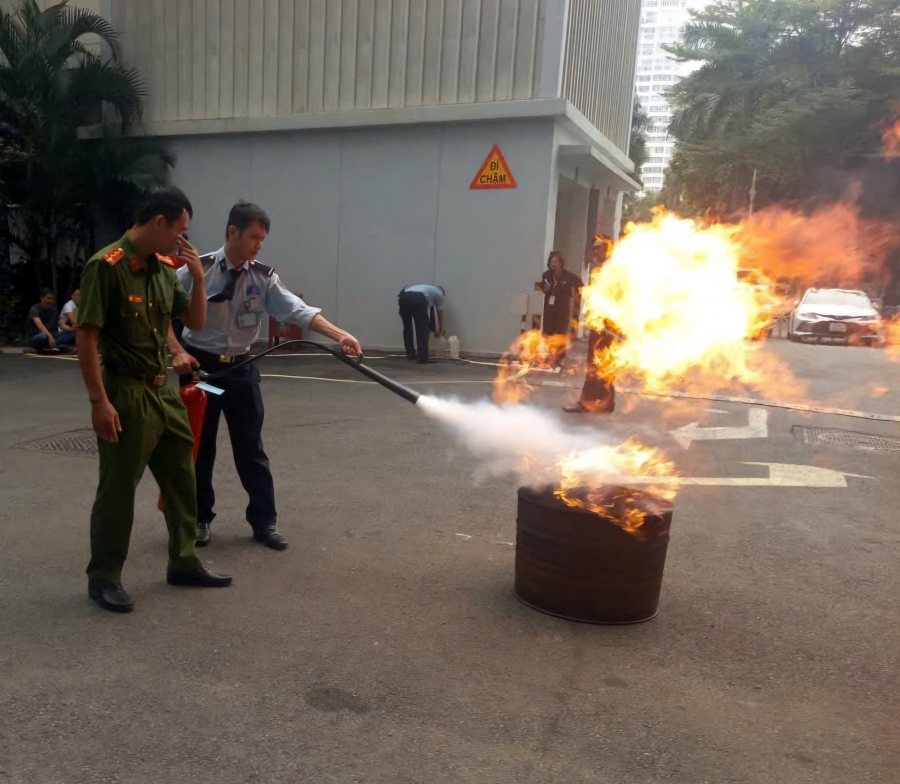 Tác phẩm phản ánh công tác luyện tập, thực tập xịt bình PCCC định kỳ, giúp mỗi nhân viên bảo vệ nắm vững quy trình và sử dụng thuần thục phương tiện PCCC xách tay.