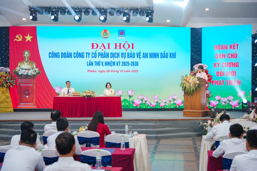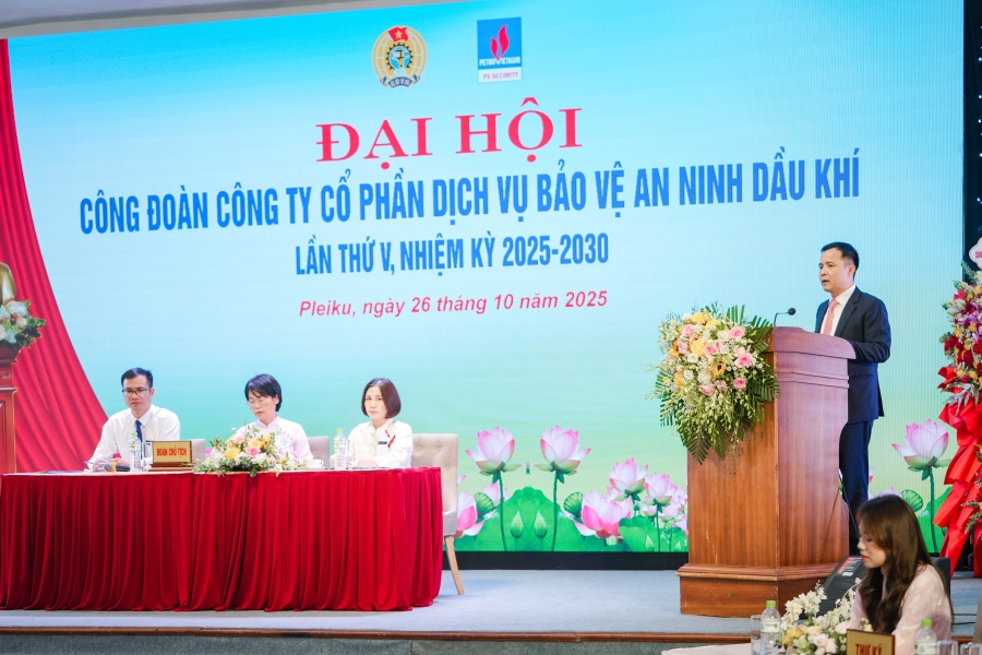 Chiều ngày 26/10/2025, tại Hội trường Khách sạn Mường Thanh, phường Pleiku, tỉnh Gia Lai, Công đoàn Công ty An ninh Dầu khí (ANDK) đã long trọng tổ chức Đại hội Công đoàn lần thứ V, nhiệm kỳ 2025 – 2030. Đại hội vinh dự được đón tiếp ông Nguyễn Trần Toàn – Ủy viên Ban Chấp hành Công đoàn Tập đoàn Công nghiệp – Năng lượng Quốc gia Việt Nam, Chủ tịch Công đoàn Tổng Công ty Cổ phần Dịch vụ Kỹ thuật Dầu khí Việt Nam (PTSC); về phía Lãnh đạo Công ty An ninh Dầu khí có sự hiện diện của ông Vũ Khánh Vinh – Bí thư Đảng ủy, Thành viên Hội đồng Quản trị, Giám đốc Công ty, cùng các đồng chí trong Ban Chấp hành Đảng ủy, Hội đồng Quản trị, Ban Giám đốc, lãnh đạo các Chi nhánh, đơn vị trực thuộc và đại diện các tổ chức chính trị - xã hội trong toàn Công ty. Đại hội có sự tham dự của 120 đại biểu chính thức, đại diện cho hơn 1500 đoàn viên công đoàn đang công tác tại các đơn vị, chi nhánh trên cả nước.